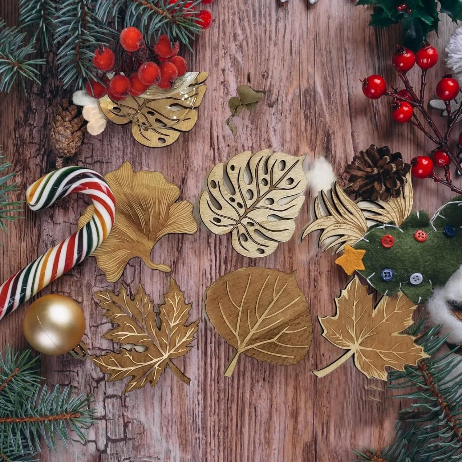 Set of 6 wooden coasters shaped like leaves. Perfect for coffee, tea, or home decor with a natural artistic touch.