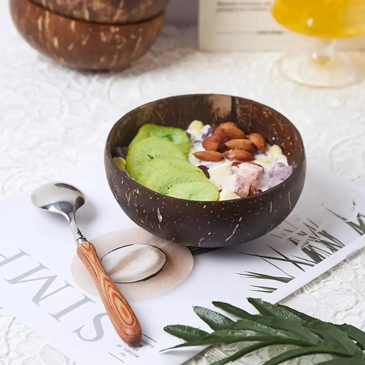 Handcrafted coconut shell bowl with a smooth natural finish. Perfect for smoothie bowls, salads, or breakfast. Lightweight, reusable, and eco-friendly.